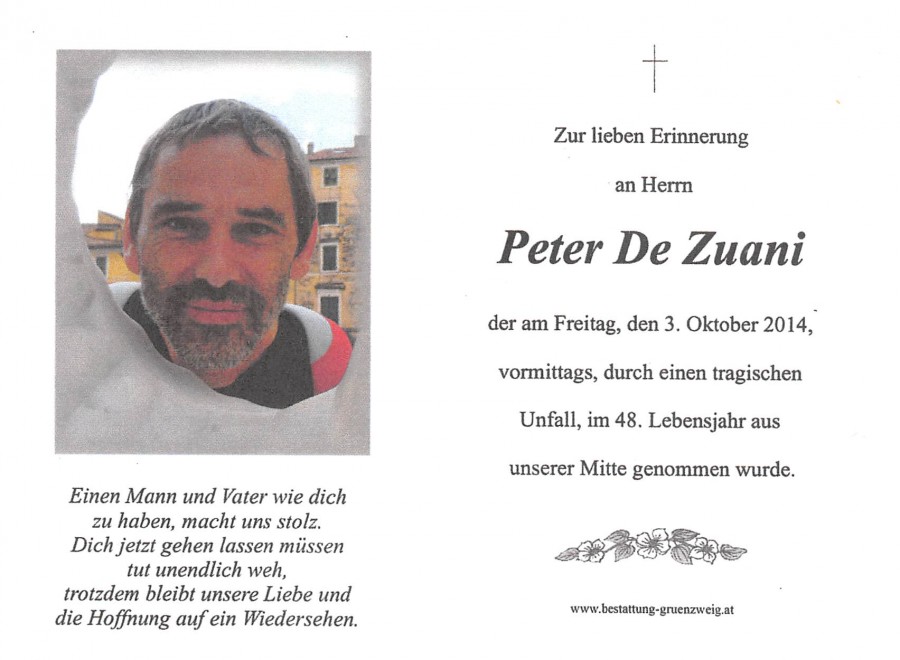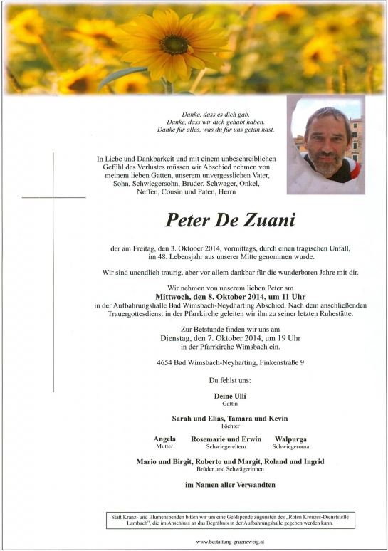 Sehr geehrte Familie De Zuani Sehr geehrte Familie De Zuani! Wir möchten Ihnen unser tiefstes Mitgefühl ausdrücken. Tabak Trafik Fischer Möglicherweise ist ein Begräbnis unter Menschen ein Hochzeitsfest unter Engeln.Khalil Gibran Zum Verfassen von Kommentaren bitte Anmelden.