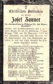 welcher als Landsturmmann des k.u.k. Infanterie-Reg.Nr.59, 15.Feldkomp., 2.Zug, Gruppe VIII, in den Kämpfen am Col della Beretta für das Vaterland gefallen ist u.auf Casa Bonato bei Cismone begraben wurde