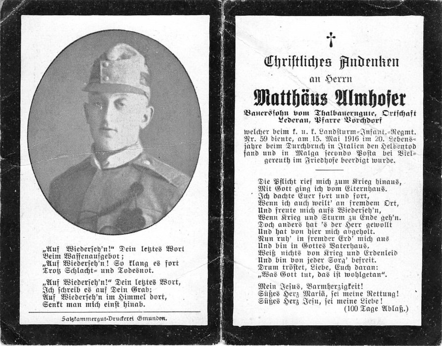 Almhofer Matthäus | 19 | 15.05.1916 | Lederau | Malga sec./Ital. | Bauerssohn |