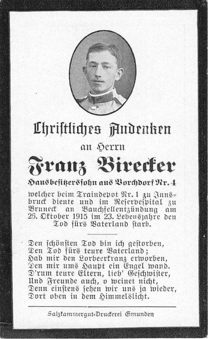 Birecker Franz | 22 | 26.10.1915 | Vorchdorf 4 | Bruneck, ITA | Hausbesitzerssohn |