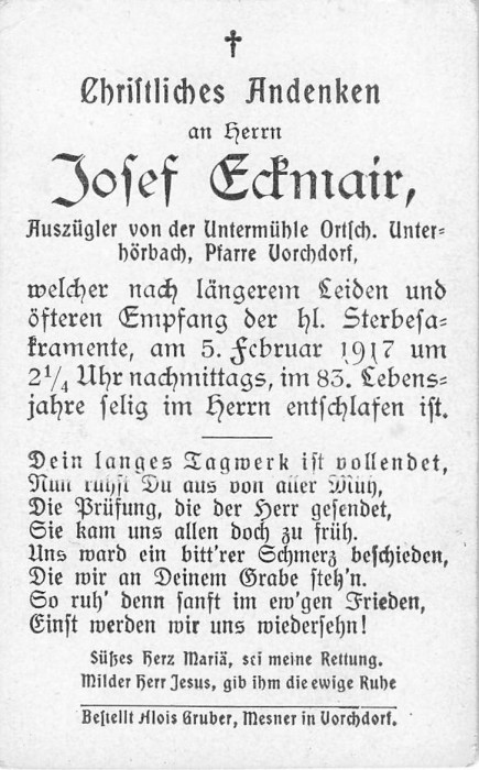 Eckmair Josef | 82 | 05.02.1917 | Unterhörbach | Vorchdorf | Auszügler |