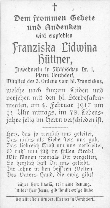Hüttner Franziska-Lidwina | 77 | 04.02.1917 | Fischböckau 1 | Vorchdorf | Inwohnerin |