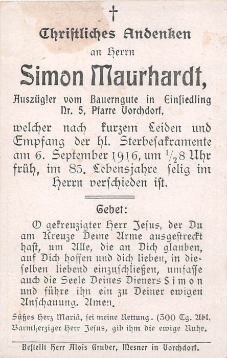 Maurhardt Simon | 84 | 06.09.1916 | Einsiedling 5 | Vorchdorf | Auszügler |
