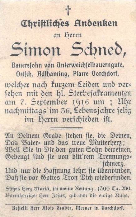 Schned Simon | 35 | 07.09.1916 | Adlhaming | Vorchdorf | Bauerssohn |