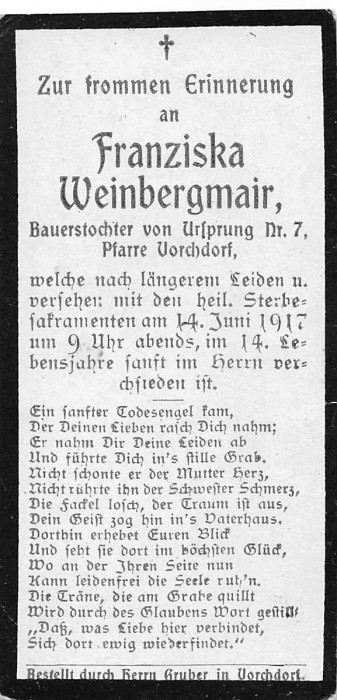 Weinbergmair Franziska | 13 | 14.06.1917 | Ursprung 7 | Vorchdorf | Bauerstochter |