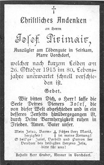 Pirimair Josef | 79 | 26.10.1915 | Seyrkam | Vorchdorf | Auszügler am |