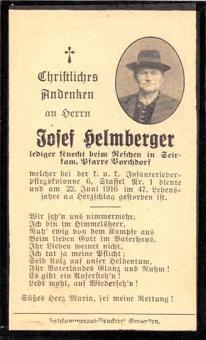 Helmberger Josef | 46 | 22.06.1916 | Seyrkam | lediger Knecht beim | |